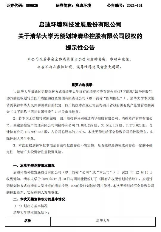 城發(fā)環(huán)境吸并啟迪環(huán)境一事,又有新消息。 不過,這一次不是兩家公司自己的動作,而是啟迪環(huán)境的母公司有了新變動。 12月11日,啟迪環(huán)境發(fā)布公告稱,四川省能源投資集團(tuán)有限責(zé)任公司(下稱“四川能投”)與清華大學(xué)于12月10日簽署《國有產(chǎn)權(quán)無償劃轉(zhuǎn)協(xié)議》,以無償劃轉(zhuǎn)方式接收清華大學(xué)持有的清華控股100%股權(quán)...