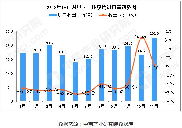 據(jù)中商產(chǎn)業(yè)研究院數(shù)據(jù)庫(kù)顯示,2018年11月中國(guó)固體廢物進(jìn)口量大幅度增長(zhǎng),2018年11月中國(guó)固體廢物進(jìn)口量為226.3萬(wàn)噸,同比增長(zhǎng)3.3%。從金額方面來(lái)看,2018年8-10月中國(guó)固體廢物進(jìn)口金額呈下降趨勢(shì),2018年11月中國(guó)固體廢物進(jìn)口金額有大幅度回升;2018年11月中國(guó)固體廢物進(jìn)口金額為...