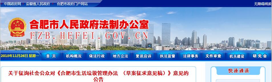 日前,合肥市發(fā)布了關(guān)于征詢社會(huì)公眾對(duì)《合肥市生活垃圾管理辦法 (草案征求意見稿)》意見的公告,詳情如下:為了提高立法透明度,充分聽取公眾的意見和建議,擴(kuò)大政府立法的公眾參與,現(xiàn)將《合肥市生活垃圾管理辦法(草案征求意見稿)》全文向社會(huì)公布,公開征求公眾意見,期望廣大網(wǎng)友和有關(guān)單位積極發(fā)表修改意見和建議...
