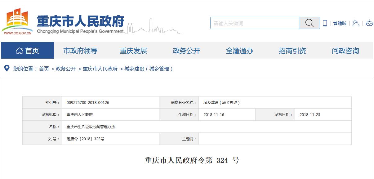 日前,重慶市政府發(fā)布了《重慶市生活垃圾分類管理辦法》,詳情如下:重慶市人民政府令第 324 號(hào)《重慶市生活垃圾分類管理辦法》已經(jīng)2018年11月1日市第五屆人民政府第30次常務(wù)會(huì)議通過(guò),現(xiàn)予公布,自2019年1月1日起施行。市 長(zhǎng) 唐良智2018年11月16日(此件公開發(fā)布)重慶市生活垃圾分類管理辦...