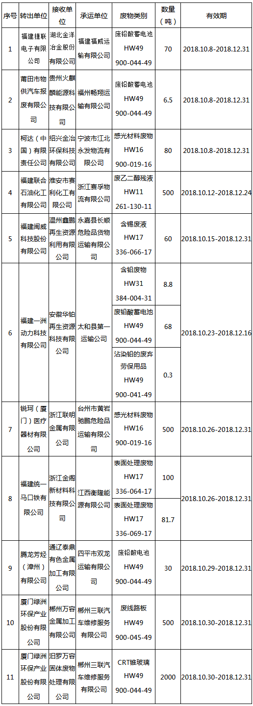 日前福建省環(huán)境保護(hù)廳發(fā)布了《2018年10月福建省危險廢物跨省轉(zhuǎn)移情況公告》,共有11項,具體內(nèi)容如下: