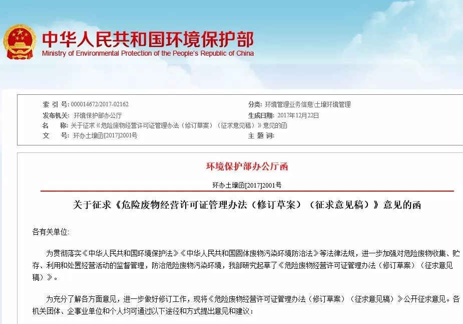 環(huán)境保護(hù)部公布的“關(guān)于征求《危險(xiǎn)廢物經(jīng)營(yíng)許可證管理辦法(修訂草案)(征求意見稿)》意見的函(環(huán)辦土壤函[2017]2001號(hào)),其中,第三十九條 以下危險(xiǎn)廢物利用或者處置活動(dòng)免于領(lǐng)取危險(xiǎn)廢物經(jīng)營(yíng)許可證:(一)產(chǎn)生危險(xiǎn)廢物的單位在其廠區(qū)(場(chǎng)所)內(nèi),自行或者委托第三方專業(yè)機(jī)構(gòu)對(duì)本單位產(chǎn)生的危險(xiǎn)廢物進(jìn)行利...