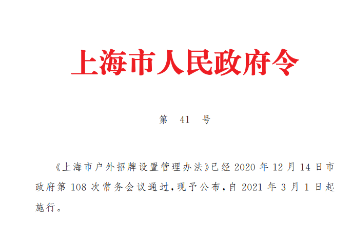 文章導(dǎo)讀戶(hù)外招牌是城市公共空間的重要組成部分,直接關(guān)系到城市安全和城市形象。安全規(guī)范、賞心美觀的戶(hù)外招牌,展現(xiàn)的是上海的文化內(nèi)涵,傳播的是上海的城市文明。《上海市戶(hù)外招牌設(shè)置管理辦法》(市政府41號(hào)令發(fā)布,以下簡(jiǎn)稱(chēng)《辦法》)將于2021年3月1日起施行。希望通過(guò)《辦法》,將主體責(zé)任、監(jiān)管責(zé)任與自治共...