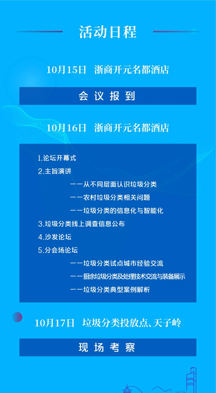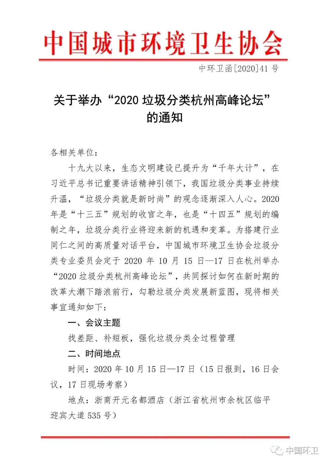 文章導讀中國城市環(huán)境衛(wèi)生協(xié)會垃圾分類專業(yè)委員會舉辦的“2020 垃圾分類杭州高峰論壇”,將于2020 年 10 月 15 日—17 日在杭州舉行。會議以“找差距、補短板,強化垃圾分類全過程管理”為主題,將薈萃全國環(huán)衛(wèi)領(lǐng)域精英,包括中國城市環(huán)境衛(wèi)生協(xié)會會長徐文龍、中國城市環(huán)境衛(wèi)生協(xié)會秘書長劉晶昊、中國...