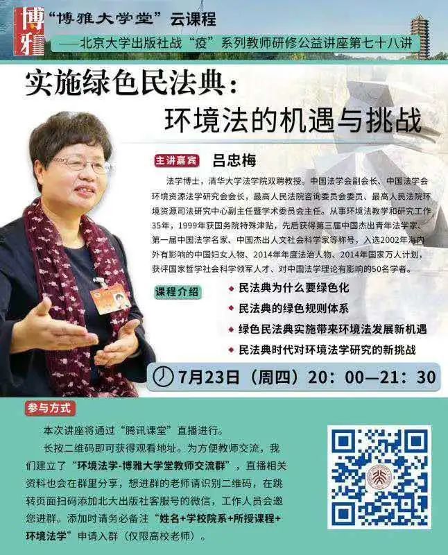文章導(dǎo)讀 本文為?呂忠梅?老師在博雅大學(xué)堂上的報告。題目為《綠色民法典實施:環(huán)境法的機遇與挑戰(zhàn)》。內(nèi)容主要涉及民法典為什么要綠色化、民法典的綠色規(guī)則體系及綠色民法典給環(huán)境法帶來的新機遇和新挑戰(zhàn)。"博雅大學(xué)堂"PPT聲明本公眾號刊載的部分文字、圖片、音頻、視頻以及網(wǎng)頁版式設(shè)計等來源于網(wǎng)絡(luò)。原作者如不愿...