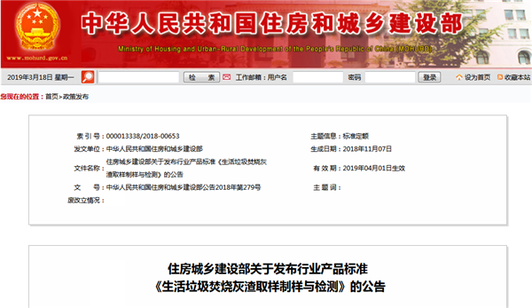 住房城鄉(xiāng)建設(shè)部關(guān)于發(fā)布行業(yè)產(chǎn)品標(biāo)準(zhǔn)《生活垃圾焚燒灰渣取樣制樣與檢測》的公告現(xiàn)批準(zhǔn)《生活垃圾焚燒灰渣取樣制樣與檢測》為城鎮(zhèn)建設(shè)行業(yè)產(chǎn)品標(biāo)準(zhǔn),編號為CJ/T531-2018,自2019年4月1日起實施。本標(biāo)準(zhǔn)在住房城鄉(xiāng)建設(shè)部門戶網(wǎng)站(www.mohurd.gov.cn)公開,并由住房城鄉(xiāng)建設(shè)部標(biāo)準(zhǔn)定額研...