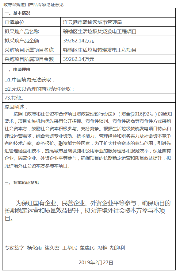 日前江蘇政府采購網(wǎng)發(fā)布了《贛榆區(qū)生活垃圾焚燒發(fā)電工程PPP項目境外社會資本采購專家論證》,論證意見為,按照《政府和社會資本合作項目財政管理暫行辦法》(財金[2016]92號)的通知要求,項目實施機構(gòu)優(yōu)先采用公開招標(biāo)、競爭性談判、競爭性磋商等競爭性方式采購社會資本方,鼓勵社會資本積極參與、充分競爭。根...