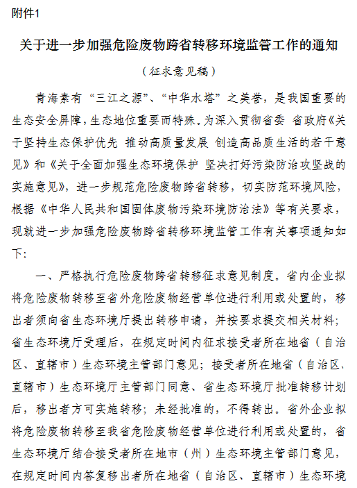 關(guān)于征求《關(guān)于進(jìn)一步加強危險廢物跨省轉(zhuǎn)移環(huán)境監(jiān)管工作的通知(征求意見稿)》意見建議的函各市(州)生態(tài)環(huán)境局,省固體廢物污染防治中心、省環(huán)境保護(hù)綜合行政執(zhí)法監(jiān)督局,相關(guān)危險廢物產(chǎn)生、經(jīng)營單位:為強化危險廢物跨省轉(zhuǎn)移環(huán)境監(jiān)管,切實防范環(huán)境風(fēng)險,青海省生態(tài)環(huán)境廳草擬了《關(guān)于進(jìn)一步加強危險廢物跨省轉(zhuǎn)移環(huán)境監(jiān)...