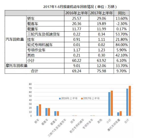 2017年上半年行業(yè)發(fā)展情況2017年上半年,我國回收拆解量較上年度同期有所上升。今年1-6月份,全國回收報(bào)廢機(jī)動車共計(jì)75.98萬輛,與2016年上半年的69.24萬輛相比,同比增長9.7%。數(shù)據(jù)來源:中國物資再生協(xié)會其中,回收報(bào)廢汽車63.92萬輛,同比增長6.1%;回收報(bào)廢摩托車12.06萬輛...