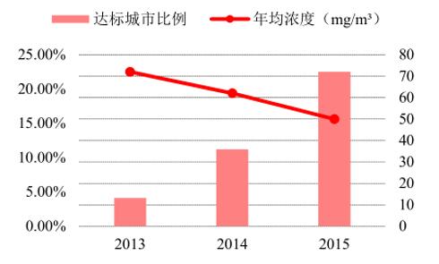 一、空氣污染猶存,顆粒物濃度超標嚴重隨著經濟快速發(fā)展,我國工業(yè)化、城鎮(zhèn)化進程加快,成為難以避免的嚴重問題。近年來,我國改善緩慢,大氣污染物的排放總量長年居高。按污染物分類來看,四類主要污染物年均濃度基本呈現逐年下降趨勢,達標城市比例有所提高,二氧化硫和氮氧化物2015年全國平均年均濃度已達到一級空氣...
