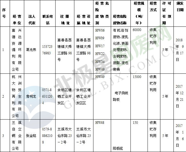 本文整理了浙江省截止至2019.1.22的危險(xiǎn)廢物經(jīng)營單位,詳情如下: