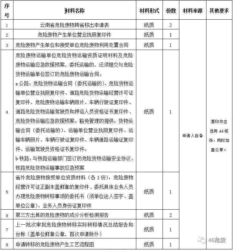 日前云南省生態(tài)環(huán)境廳發(fā)布了《危險(xiǎn)廢物轉(zhuǎn)移跨省審批辦事指南(完整版)》(報(bào)批稿),公示了申請(qǐng)材料目錄,并提出危險(xiǎn)廢物轉(zhuǎn)移跨省審批需符合三個(gè)條件:1.接受地省級(jí)環(huán)境保護(hù)行政主管部門(mén)同意;2.危險(xiǎn)廢物接受單位危險(xiǎn)廢物經(jīng)營(yíng)許可證(或相關(guān)證明文件)有效;轉(zhuǎn)移的危險(xiǎn)廢物符合危險(xiǎn)廢物經(jīng)營(yíng)許可范圍;危險(xiǎn)廢物接受單位...