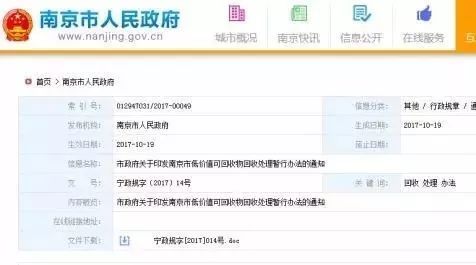 文章導讀 10月19日,南京市政府公布了《南京市低價值可回收物回收處理暫行辦法》,根據(jù)辦法規(guī)定,城市管理部門負責管理轄區(qū)內(nèi)低價值可回收物回收工作,并通過政府采購方式向企業(yè)購買低價值可回收物的回收、處理服務。辦法自今年11月20日起施行,有效期3年。 《辦法》公布后,南京成為繼廣州之后,又一個出臺有關...