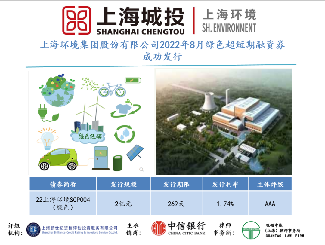 文章導(dǎo)讀8月30日,上海環(huán)境集團(tuán)股份有限公司成功發(fā)行22上海環(huán)境SCP004(綠色),融資規(guī)模2億元,期限269天,用于滿足下屬子公司日常運(yùn)營(yíng)的資金需求。本次發(fā)行綠色超短融最終票面利率為年化1.74%。上海環(huán)境通過(guò)積極響應(yīng)綠色金融活動(dòng),參與經(jīng)濟(jì)社會(huì)綠色低碳轉(zhuǎn)型,助力“碳達(dá)峰”、“碳中和”。2021年...