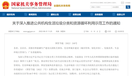 關(guān)于深入推進(jìn)公共機(jī)構(gòu)生活垃圾分類和資源循環(huán)利用示范工作的通知國(guó)管節(jié)能〔2022〕249號(hào)各省、自治區(qū)、直轄市和新疆生產(chǎn)建設(shè)兵團(tuán)機(jī)關(guān)事務(wù)、住房和城鄉(xiāng)建設(shè)(城市管理、綠化市容)、發(fā)展改革、生態(tài)環(huán)境主管部門(mén),廣東省能源局:為深入貫徹習(xí)近平總書(shū)記關(guān)于垃圾分類工作的重要指示精神,全面落實(shí)《中華人民共和國(guó)固體廢...