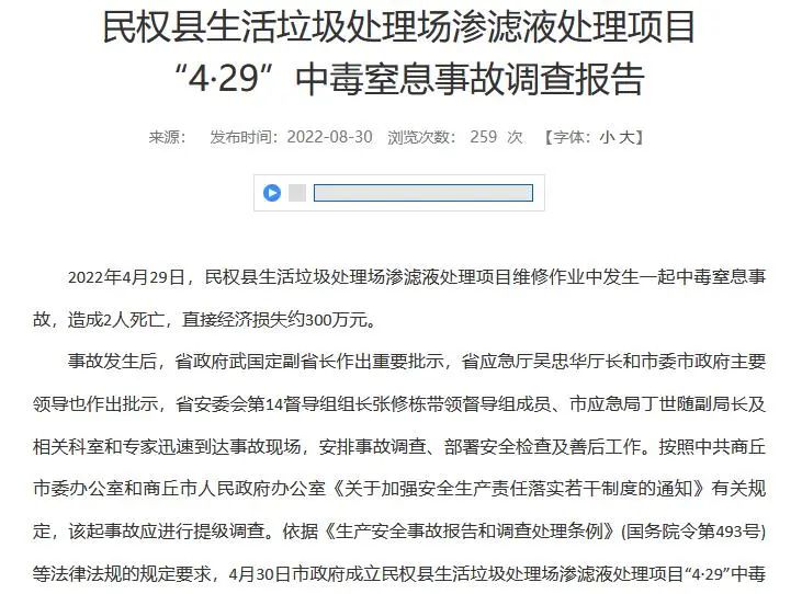 2022年4月29日,民權(quán)縣生活垃圾處理場(chǎng)滲濾液處理項(xiàng)目維修作業(yè)中發(fā)生一起中毒窒息事故,造成2人死亡,直接經(jīng)濟(jì)損失約300萬(wàn)元。民權(quán)縣生活垃圾處理場(chǎng)滲濾液處理項(xiàng)目“4·29”中毒窒息事故調(diào)查報(bào)告2022年4月29日,民權(quán)縣生活垃圾處理場(chǎng)滲濾液處理項(xiàng)目維修作業(yè)中發(fā)生一起中毒窒息事故,造成2人死亡,直接...