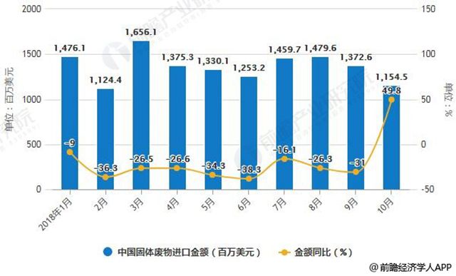 在進口金額方面,2018年8-9月中國固體廢物進口金額下降,2018年10月中國固體廢物進口金額維持下降趨勢。2018年10月中國固體廢物進口金額為1155百萬美元,同比增長49.8%。