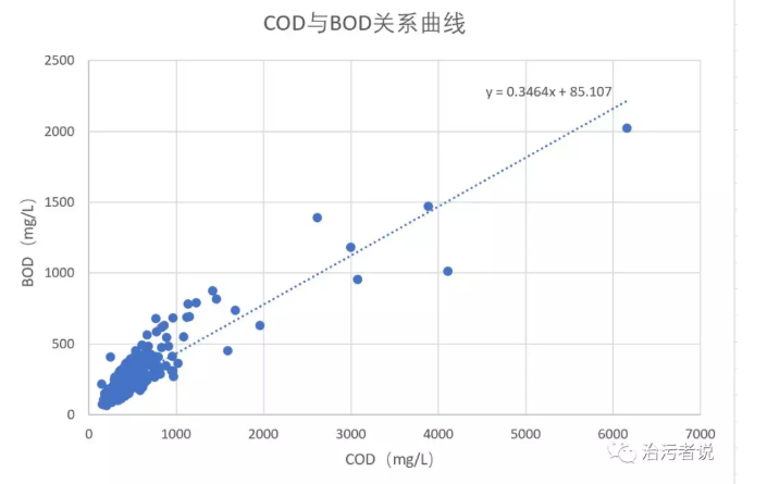 這個(gè)方程和我們數(shù)學(xué)計(jì)算的方程基本一致,因此可以知道數(shù)學(xué)方法和表格方法都是可以完成這個(gè)線性方程式的推算的。這個(gè)線性方程的得出,可以便捷的通過進(jìn)水的COD來快捷的判斷進(jìn)水的BOD值,不必要等到5天后出來BOD5再來判斷系統(tǒng)的碳源是否充足。