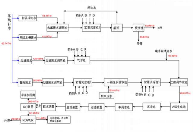 該工程設(shè)計(jì)按照氧化線處理水量10000噸/月,立式噴涂線處理水量3000噸/月,按每月30天,24小時(shí)連續(xù)運(yùn)行設(shè)計(jì)整個(gè)系統(tǒng)。經(jīng)過生化系統(tǒng)處理的水,進(jìn)回用水系統(tǒng),產(chǎn)生的濃水符合排放標(biāo)準(zhǔn)排入市政管網(wǎng)。