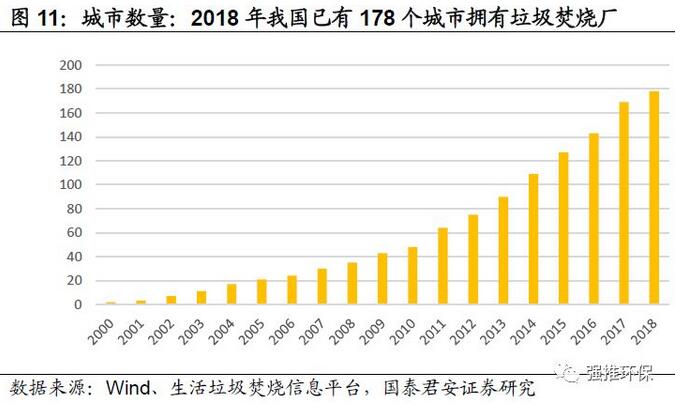 行業(yè)新增焚燒需求,主要來自城市化進程以及原有城市環(huán)衛(wèi)服務(wù)開始覆蓋鄉(xiāng)鎮(zhèn)而收集面積增大。帶動三四線城市新建項目以及原有項目的擴建需求。1)新建項目向三四線城市拓展趨勢較明顯,我國有垃圾焚燒廠的城市個數(shù)由2011年的64個增加到2018年的178個;2)52%的已投運項目已經(jīng)或正在擴建,在已投運的362個項目中,其中175個為單體項目,187個已經(jīng)或正在二期及三期擴建。
