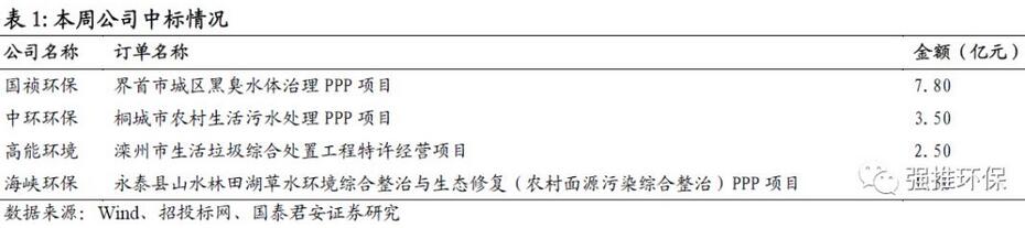 根據(jù)公告與招投標信息統(tǒng)計,本周環(huán)保公司中新增訂單4單、中標總金額15.3億;新增訂單前三名分別為國禎環(huán)保、中環(huán)環(huán)保和高能環(huán)境。