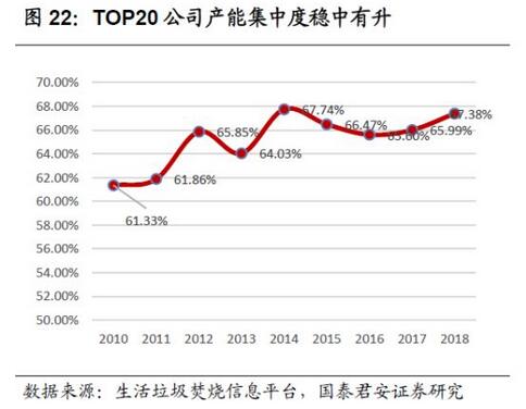 隨著環(huán)保標準和監(jiān)管趨嚴,具有品牌效應(yīng)、運營經(jīng)驗、政府關(guān)系和資金實力的龍頭公司在拓展業(yè)務(wù)方面更具優(yōu)勢,預(yù)計行業(yè)集中度有進步一步提升趨勢。2010-2018上半年以來,行業(yè)中投產(chǎn)產(chǎn)能TOP20的公司合計投產(chǎn)占全行業(yè)總產(chǎn)能的比例由61%上升到67%。
