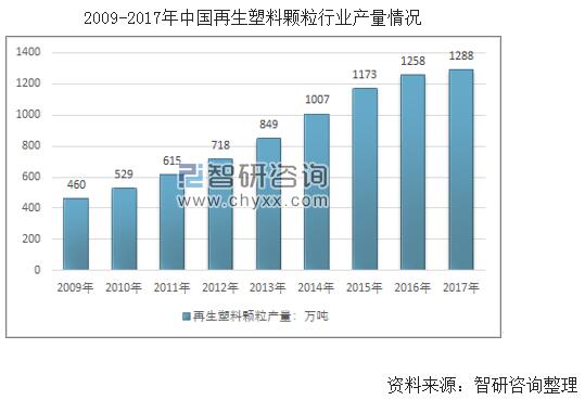 智研咨詢發(fā)布的《2019-2025年中國(guó)廢塑料回收行業(yè)市場(chǎng)運(yùn)營(yíng)模式分析及發(fā)展趨勢(shì)預(yù)測(cè)研究報(bào)告》數(shù)據(jù)顯示:近幾年,我國(guó)再生塑料顆粒行業(yè)產(chǎn)量快速增長(zhǎng),從2009年的460萬噸增長(zhǎng)到2017年的1288萬噸,近幾年我國(guó)再生塑料顆粒行業(yè)產(chǎn)量情況如下圖所示: