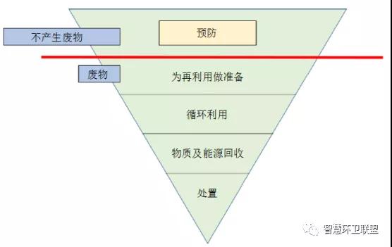 金字塔中的預(yù)防指:在設(shè)計(jì)和制造產(chǎn)品的過程中,盡量減少原料的使用量;延長(zhǎng)產(chǎn)品的使用壽命;減少有害物質(zhì)的使用量。為再利用做準(zhǔn)備指:對(duì)產(chǎn)品的整體或部件進(jìn)行檢查、清理、修理、翻新等工作。循環(huán)利用指:使用廢物生產(chǎn)新的物質(zhì)或產(chǎn)品,包括堆肥。其他回收手段指:使用厭氧消化、焚燒發(fā)電、氣化等手段產(chǎn)生能量(包括燃料、熱、電)和一些物料(可以用作回填物)。處置指:填埋和沒有能量回收手段的焚燒。