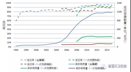 芬蘭的押金體系實(shí)現(xiàn)了極高的回收率。在PALPA體系剛剛成立的1996年,一次性金屬罐的回收率就已經(jīng)達(dá)到了59%,并馬上于第二年上升到了79%。到了2009年,金屬罐的回收率已經(jīng)超過90%。同樣地,PET瓶的押金體系在2008年開始實(shí)施時(shí),返還率就已經(jīng)達(dá)到了71%,之后在兩年內(nèi)便上升到了90%以上。玻璃瓶在芬蘭擁有很長(zhǎng)的押金制度實(shí)施積累,因此在PALPA在建立針對(duì)玻璃瓶的回收體系后,回收率就一直高于80%。從圖11還可以看出,一次性鐵罐的回收量自2004年起至2012年,一直都在迅速上升,并且保持穩(wěn)定的高回收率,反映出芬蘭飲料產(chǎn)業(yè)使用一次性金屬罐替代可重復(fù)使用玻璃瓶的趨勢(shì)??芍貜?fù)使用玻璃瓶的回收率則更高,在2014年時(shí)為97%、2015年時(shí)為98%。