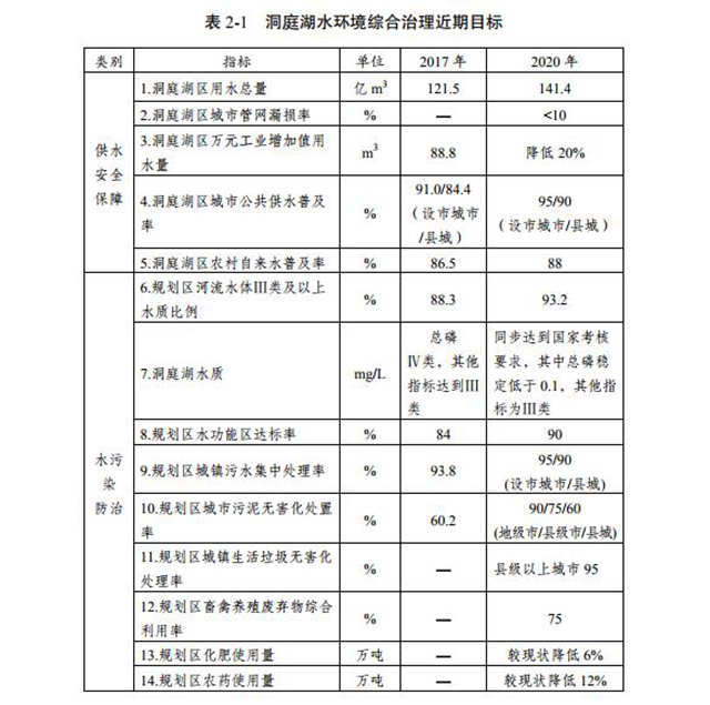二、通過實施《規(guī)劃》,到2020年,洞庭湖區(qū)城鄉(xiāng)供水安全能力進一步提高,富營養(yǎng)化程度下降,規(guī)劃區(qū)水生態(tài)環(huán)境質(zhì)量惡化趨勢得到遏制,生態(tài)系統(tǒng)功能有所改善。到2025年,洞庭湖區(qū)城鄉(xiāng)供水安全全面保障,規(guī)劃區(qū)水生態(tài)環(huán)境質(zhì)量顯著改善,生態(tài)系統(tǒng)良性發(fā)展。到2035年,洞庭湖區(qū)水資源水環(huán)境承載能力與建設(shè)社會主義現(xiàn)代化國家水安全保障要求相適應(yīng),生態(tài)環(huán)境根本好轉(zhuǎn),規(guī)劃區(qū)水生態(tài)環(huán)境質(zhì)量全部達標,建設(shè)美麗洞庭湖目標基本實現(xiàn)。