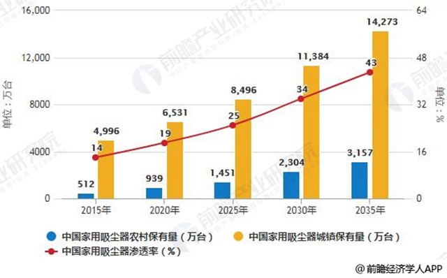 2015-2035年中國(guó)家用吸塵器保有量及滲透率統(tǒng)計(jì)情況預(yù)測(cè)