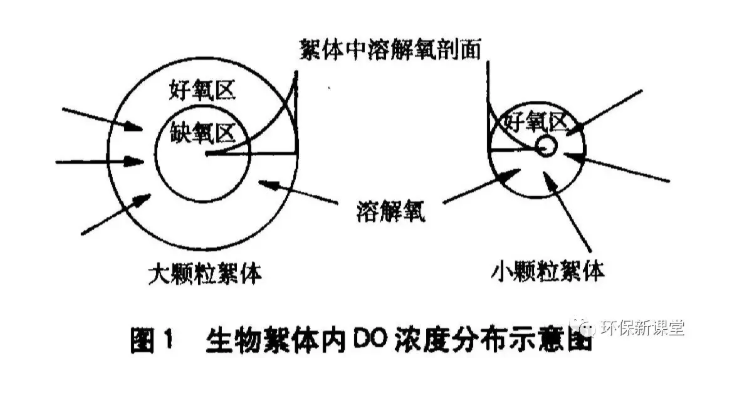 缺氧微環(huán)境理論是目前已被普遍接受的一種機理,被認為是同步硝化/反硝化發(fā)生的主要原因之一。這一理論的基本觀點認為:在活性污泥的絮體中,從絮體表面至其內核的不同層次上,由于氧傳遞的限制原因,氧的濃度分布是不均勻的,微生物絮體外表面氧的濃度較高,內層濃度較低。在生物絮體顆粒尺寸足夠大的情況下,可以在菌膠團內部形成缺氧區(qū),在這種情況下,絮體外層好氧硝化菌占優(yōu)勢,主要進行硝化反應,內層為異樣反硝化菌占優(yōu)勢,主要進行反硝化反應(如圖1)。除了活性污泥絮凝體外,一定厚度的生物膜中同樣可存在溶氧梯度,使得生物膜內層形成缺氧微環(huán)境。