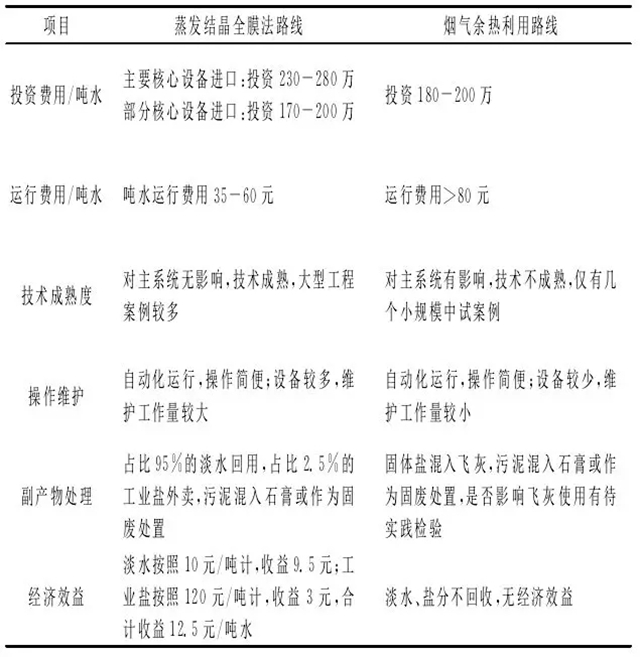 蒸發(fā)結(jié)晶全膜法工藝路線與煙氣余熱利用工藝路線比選。煙氣余熱利用廢水零排放是近來比較熱的技術(shù),經(jīng)常拿來跟蒸發(fā)結(jié)晶式零排放工藝相提并論,但它不能實(shí)現(xiàn)水資源和鹽資源的回收和再利用。2種工藝路線比較結(jié)果,見表2。