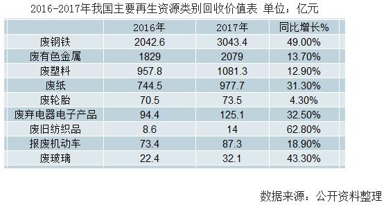 截至2017年底,我國廢鋼鐵、廢有色金屬、廢塑料、廢輪胎、廢紙、廢棄電器電子產(chǎn)品、報(bào)廢機(jī)動車、廢舊紡織品、廢玻璃、廢電池十大類別的再生資源回收總量為2.82億噸,同比增長11%。其中,廢電池、廢玻璃、廢舊紡織品回收量增幅較為明顯,分別增長46.7%、24.4%和29.6%;廢塑料和報(bào)廢機(jī)動車回收量出現(xiàn)下滑,分別同比減少9.9%和7.7%。