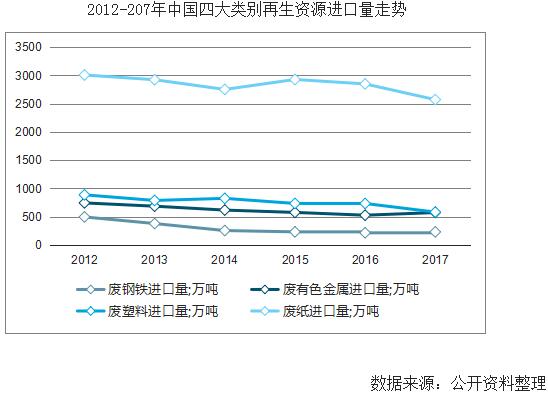 2017年,我國廢鋼鐵、廢有色金屬、廢塑料、廢紙、廢舊紡織品五大類別的再生資源進(jìn)口總量3620.9萬噸,同比下降9.9%。其中降幅最大的是廢塑料,同比下降20.7%。廢舊紡織品進(jìn)口量與2016年相比,減少6.2%。再生資源進(jìn)口量下降主要是由于《禁止洋垃圾入境推進(jìn)固體廢物進(jìn)口管理制度改革實(shí)施方案》等一系列政策對行業(yè)產(chǎn)生的影響逐漸顯現(xiàn)。