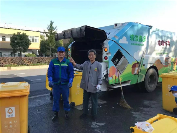 8點(diǎn)30分,龔磊來到了第三車的第一個(gè)作業(yè)點(diǎn),丁橋陽光翡麗灣。這個(gè)時(shí)間點(diǎn),上班的上班,上學(xué)的上學(xué)。小區(qū)保潔員過來把已經(jīng)清空的垃圾桶拖回小區(qū)集置點(diǎn),保潔大伯不斷夸著這兩個(gè)年輕人干活利索,態(tài)度又好,非得跟龔磊來了一張難得的合影并豎起了大拇指,而龔縵琴害羞地躲開去拉桶了。