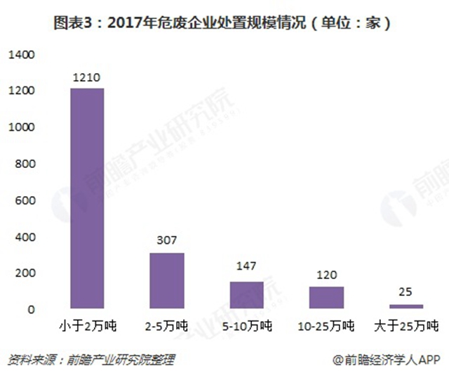 正因此,我國危廢處理行業(yè)參與者較多,但企業(yè)規(guī)模普遍較小。根據(jù)2017年7月的數(shù)據(jù)統(tǒng)計(jì),我國危廢處理企業(yè)產(chǎn)能低于2萬噸、2-5萬噸、5-10萬噸、10-25萬噸和25萬噸以上的企業(yè)數(shù)量分別為1210家、307家、147家、120家和25家,67%的企業(yè)危廢處理產(chǎn)能低于2萬噸。