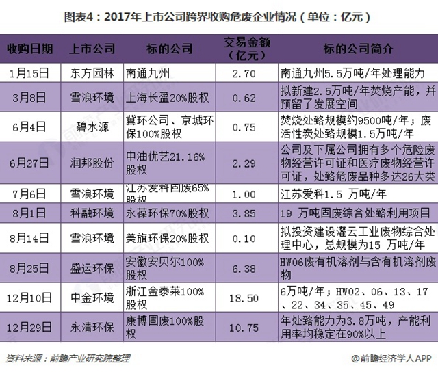 由于危廢處理處臵行業(yè)市場毛利率高,現(xiàn)金流好,且在未來的幾年間供需關(guān)系將持續(xù)緊張的大背景下,項(xiàng)目的盈利能力有進(jìn)一步提升的空間,因此具備資金和項(xiàng)目管理優(yōu)勢的上市環(huán)保公司出于產(chǎn)業(yè)布局和財(cái)務(wù)投資的角度,在最近兩年(特別是2017年后)通過并購的方式大舉進(jìn)入危廢領(lǐng)域。