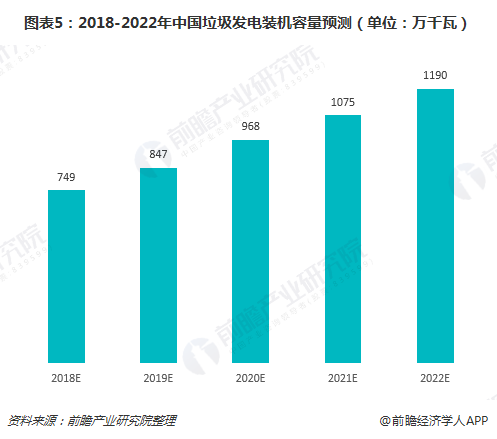 另一方面,垃圾焚燒發(fā)電尚處于快速發(fā)展時期。在此期間,垃圾焚燒發(fā)電行業(yè)進入可持續(xù)現(xiàn)代化發(fā)展軌道,大型專業(yè)化企業(yè)引領(lǐng)行業(yè)發(fā)展,行業(yè)集中度逐步提高,形成較大的行業(yè)規(guī)模。根據(jù)預(yù)測,2018-2022年,垃圾發(fā)電裝機容量年均復(fù)合增長率約為12.27%,預(yù)計到2022年中國垃圾發(fā)電裝機容量將達到1190萬千瓦。