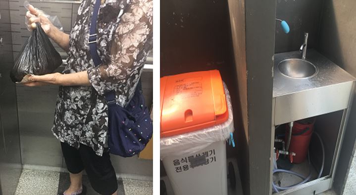 下圖中,左邊的大桶為“食物垃圾回收桶”,右邊的小桶為食物垃圾塑料袋收集桶,兩個桶都帶有腳閥,居民可以用腳閥打開桶蓋,避免弄臟雙手。食物垃圾桶旁邊通常設有洗手池及肥皂,丟棄垃圾時弄臟雙手可以清洗?;厥召M用由整個小區(qū)的人一起平攤,收費包含在每個月的物業(yè)管理費中。以軍浦市某小區(qū)為例,2018年1-7月,每家每月的食物垃圾處理費約為人民幣4-6元。