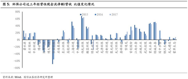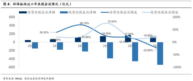 PPP帶動投資性現(xiàn)金流支出的大幅提升使得環(huán)保企業(yè)現(xiàn)金流緊張。從經(jīng)營性現(xiàn)金流來看,雖然近年來環(huán)保企業(yè)營收和利潤大幅增長,經(jīng)營性現(xiàn)金流有所改善,但經(jīng)營性現(xiàn)金流的增長卻趕不上營收和利潤的增速?,F(xiàn)金回流成為業(yè)績高速增長的環(huán)保行業(yè)的一大痛點。環(huán)保板塊整體經(jīng)營性現(xiàn)金流凈額的增速從2015年開始顯著下降,而對應(yīng)的凈利潤增速卻同年顯著上升。到2017年,環(huán)保板塊整體經(jīng)營性現(xiàn)金流凈額出現(xiàn)了-22.7%的負(fù)增長。
