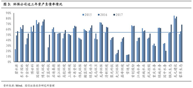 環(huán)保企業(yè)資產(chǎn)負(fù)債率逐年攀升。近年來,隨著PPP的大規(guī)模拓展,環(huán)保行業(yè)投資驅(qū)動的模式越發(fā)明顯,企業(yè)不斷融資用于投資新簽的環(huán)保工程項目,企業(yè)資產(chǎn)負(fù)債率逐漸提升。環(huán)保板塊主要公司的平均資產(chǎn)負(fù)債率從2015年的48%,到2016年的52%,到2017年末增長到54%。