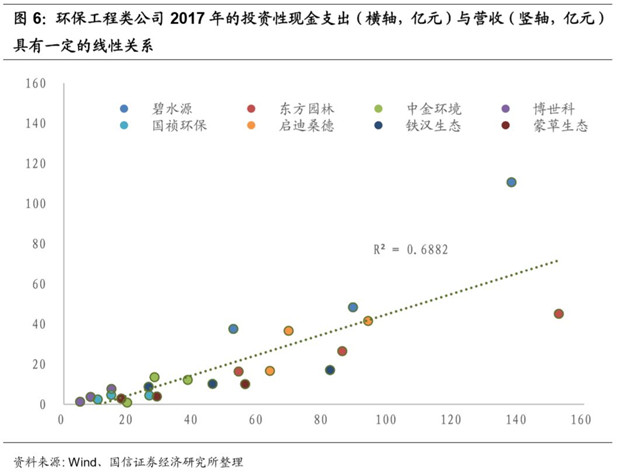 投資驅(qū)動工程,融資能力是投資工程類企業(yè)的核心競爭力。我們通過比較環(huán)保工程類公司的投資性現(xiàn)金支出與營收的關(guān)系發(fā)現(xiàn)兩者的線性關(guān)系還是比較明確的。在PPP大力發(fā)展工程業(yè)務(wù)的模式下,企業(yè)要保障業(yè)績的增速就要不斷的加大投資,所以充裕的現(xiàn)金和強大的融資能力是投資工程類企業(yè)的驅(qū)動力。