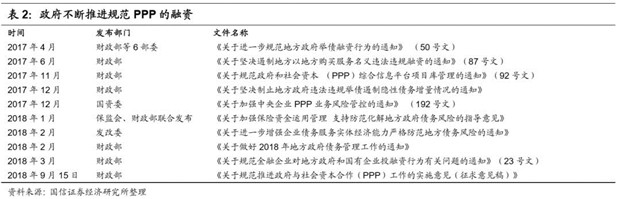 2018年下半年以來,PPP項目的清查告一段落。在中央政治局會議強調(diào)“六個穩(wěn)”后,發(fā)改委要求加快推進(jìn)基建投資,基建補短板的功能越發(fā)重要。2018年10月31日國務(wù)院發(fā)布《關(guān)于保持基礎(chǔ)設(shè)施領(lǐng)域補短板力度的指導(dǎo)意見》明確表示,對經(jīng)核查符合規(guī)定的PPP項目加大推進(jìn)力度,積極推動符合條件項目發(fā)行債券、規(guī)范開展資產(chǎn)證券化。PPP被認(rèn)為是進(jìn)一步加大投入的重要推動力,主管部門也為下一步PPP的發(fā)展做了相應(yīng)的規(guī)范和準(zhǔn)備: