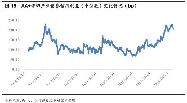 整個市場債券的信用利差已出現(xiàn)下降的趨勢。AA+評級的債券(大部分優(yōu)質(zhì)環(huán)保公司的債券評級,包括碧水源、東方園林等)的信用利差從4月份開始快速攀升,顯示了市場資金對于發(fā)債企業(yè)的償還能力的擔(dān)憂。最高信用利差達(dá)到了225bp左右,目前已經(jīng)出現(xiàn)了下降的趨勢。