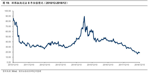 從過去8年的估值來看,環(huán)保板塊從2015年6月開始,估值一路下挫,從2015年的86X一路下殺到到2018年12月的19倍,創(chuàng)歷史新低。從估值層面來看,環(huán)保板塊處于估值的歷史低位,下行空間不大,隨著后續(xù)政策、資金等利好兌現(xiàn),板塊估值有待修復(fù)。