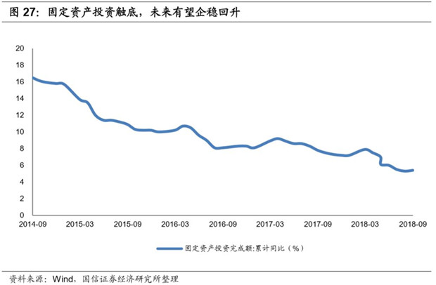 固定資產(chǎn)投資觸底。2018年1-9月,固定資產(chǎn)投資增速為5.4%,同比回落2.1pct,環(huán)比提升0.1pct,年內(nèi)首次實現(xiàn)環(huán)比提升,未來有望企穩(wěn)回升。
