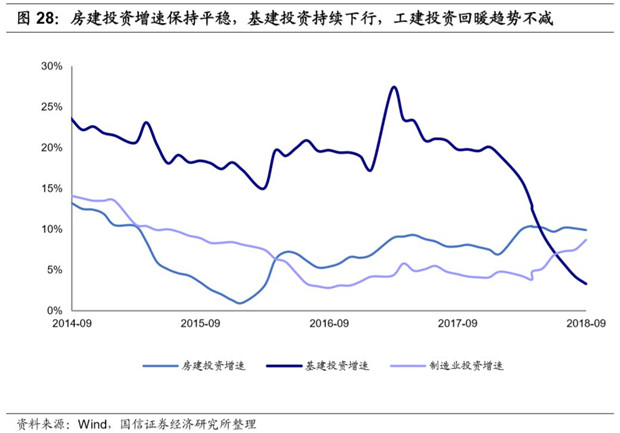 具體來看,基建投資受宏觀降杠桿、PPP清庫以及地方政府債務(wù)約束等影響,增速大幅下滑, 2018年1-9月實現(xiàn)3.3%的正增長,比2017年同期下滑16.5pct;房建投資受年初至今房地產(chǎn)景氣帶動,增速相對平穩(wěn),目前仍維持在相對高位的水平,2018年1-9月實現(xiàn)9.9%的正增長;工建投資(制造業(yè))從今年3月份開始觸底回升, 2018年1-9月實現(xiàn)8.7%正增長,增速環(huán)比提升1.2pct,實現(xiàn)連續(xù)六個月回升。