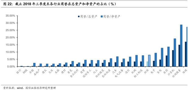 截至三季度末,A股上市公司商譽達(dá)到1.45萬億元,同比增長15.18%、環(huán)比增長4.05%,在A股歷史上首度突破1.4萬億元。環(huán)保行業(yè)的商譽共222.61億,占總資產(chǎn)比例為3.48%,占凈資產(chǎn)比例為7.92%。在所有行業(yè)中,環(huán)保商譽總額222.61億,在所有27個行業(yè)中排名第21位(21/27),總金額并不多。從商譽占總資產(chǎn)與凈資產(chǎn)比例來看,環(huán)保行業(yè)商譽占總資產(chǎn)比例為3.48%,商譽占凈資產(chǎn)比例為7.92%,在所有行業(yè)中排名第7位(7/27),僅低于傳媒、休閑服務(wù)、計算機、醫(yī)藥、家電、電子,處于較高水平。
