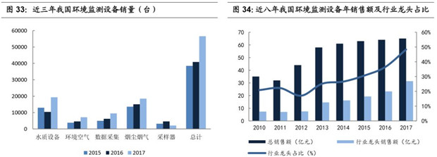 2017年監(jiān)測設(shè)備開始出現(xiàn)快速增長,市場集中度提升。原先由于全國范圍內(nèi)傳統(tǒng)監(jiān)測站的建造已經(jīng)基本完成,環(huán)境監(jiān)測設(shè)備行業(yè)銷售規(guī)模增速在2016年前放緩至1-2%之間,隨著垂管的推廣,監(jiān)測站點的下沉,2017年行業(yè)銷售數(shù)據(jù)顯著增長。據(jù)中國環(huán)境保護產(chǎn)業(yè)協(xié)會環(huán)境監(jiān)測儀器專業(yè)委員會統(tǒng)計,2017年,我國共計銷售各類環(huán)境監(jiān)測產(chǎn)品56,575 臺(套),同比2016 年增長38.5%。全行業(yè)2017年的總銷售額突破了65 億元,同比增長了1.56%,但市場集中度顯著提升。環(huán)境監(jiān)測行業(yè)內(nèi)的5 家上市公司,聚光科技、先河環(huán)保、雪迪龍、中節(jié)能環(huán)保裝備下屬子公司中節(jié)能天融科技和盈峰環(huán)境下屬子公司宇星科技,2017 年度環(huán)境監(jiān)測設(shè)備的銷售額共計達(dá)到31.4 億元,同比增長34.8%,市場占有率由2016 年的36.4% 提升至2017年的48.1%。